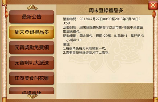 ▲ 在「武林Q 传」中,为了鼓励大家多多上线,周末时甚至还有「周末礼包」可以拿,一次就有20 万的银两,真的是非常滋补啊!