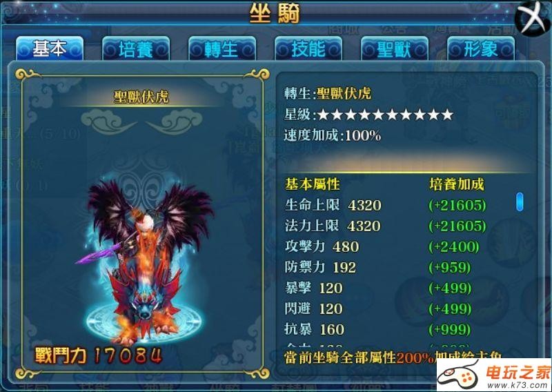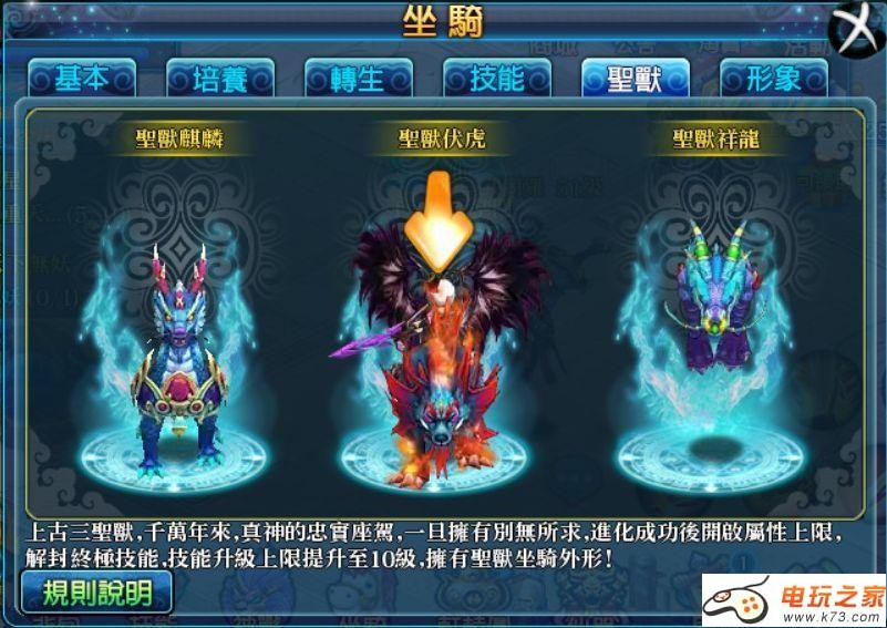 坐骑转生到八阶后,开启圣兽转生系统,总共有三种圣兽的外型可以选择,分别是圣兽麒麟、圣兽伏虎及圣兽祥龙,转生为圣兽后,可获得圣兽的坐骑型态并且提高技能等级的上限到10 级,同时坐骑属性大幅度增加,并且坐骑对玩家角色的属性加成百分比大幅度提升,总而言之就是坐骑的最终型态,前面的坐骑培养及坐骑转生、坐骑技能都是在为坐骑转生为圣兽作奠基,当坐骑转生为圣兽后,坐骑系统才算完成。