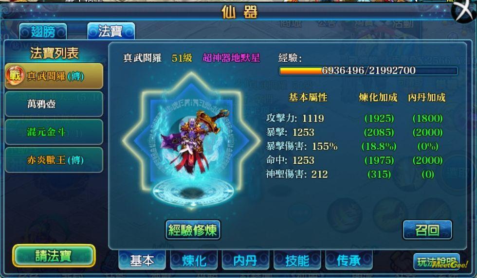 而法宝可以说是一种战斗型的宠物或佣兵,玩家可以自由选择不同功能的法宝出战,在战斗时法宝会对玩家攻击的目标进行攻击及反击,不同功能的法宝的战斗方式不太一样,有的擅长单体、有的擅长群攻、有的擅长控制,真实的情况还得视法宝种类而定。法宝本身能够修炼,也就是挂网升级,同时也能够打怪升级,在玩家打怪时法宝同样能够获得一定的经验值,同时还可以装备内丹来强化属性,并且还可以学习主动及被动技能,只要玩家拥有足够的仙魂值就可以召唤更多的法宝出战,所以说法宝是一种战斗型的宠物或佣兵一点也不为过。