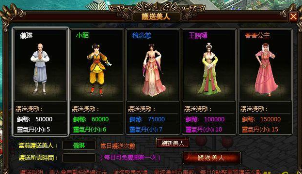 护送美女类似运标活动,只是玩家们运送的不是标车,而是一个个如花似玉的美女,让玩家在运送过程中能保持愉快的心情,护送美女每日共可完成2 次,不过免费刷新次数只有1 次,想要护送最高阶的香香公主,可能就得拿出元宝来才行,另外每天在11 点到11 点半和18 点半到19 点之间参加护送美女,更可获得两倍的铜币与灵气丹,更是千万不可错过。