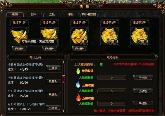 每日累积上线是最简单最轻松获得铜币与道具的管道,只要每天登入后保持持续在线,即可领取各式各样丰富的奖励。