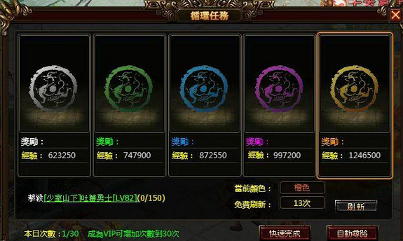 循环任务并没有什么难度,也是大量额外经验值的来源,玩家每日共可参加15 次,若有VIP 则次数可增加至30 次,循环任务一共有5 种颜色,颜色越高可获得的经验就越高,怪物也相对越强,循环任务可由右方任务追踪上直接接取,每天千万要记得将次数用完喔!