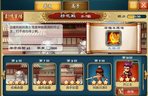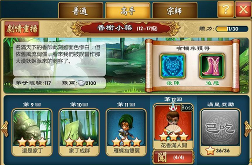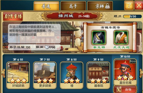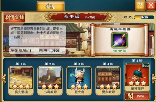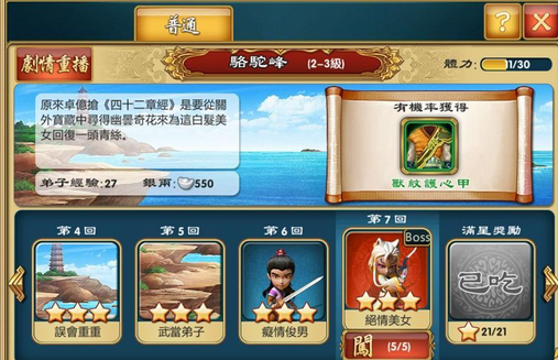 在副本关卡中,BOSS 关卡通常都会掉比较高等级的装备、武功与阵法,不过一天只限定5 次挑战的机会,建议大家如果BOSS 已经可以打得过(不论星等,只求过关),就不要浪费掉了。