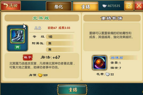 不过装备的「重铸」会需要使用到商城道具的「熔炼石」,以及消耗小额银两来完成。一般来说,品质「乙」以上但小品质不佳的装备,才有必要透过「重铸」来强化,品质太过低落的装备,其实没有额外多花钱的必要。