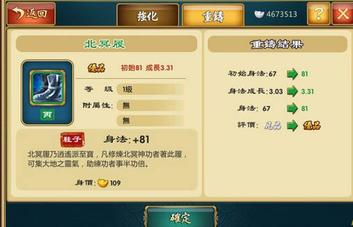 另外要特别注意的是,经由「强化」之后的装备,在进行「重铸」之后会让原本已强化的属性完全「洗白」,为了避免白花钱,装备该先「重铸」的,就请先不要花钱「强化」了,以免造成银两的浪费。