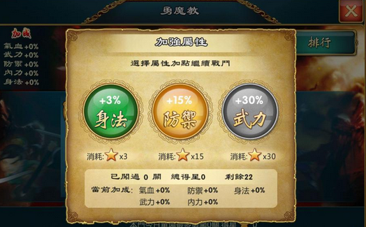 ▲在「魔教总坛」闯关的过程中,也会出现能让我们以「星星」换取不同能力强化的「加强属性」机制,玩家可别错过这样强化的机会。