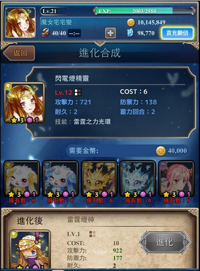 ▲ 每张卡牌都有「最高等级」的限制,若是想要让卡牌的能力更上一层楼,就需要透过「进化合成」让卡牌「转生」成另一张更强大的卡牌!