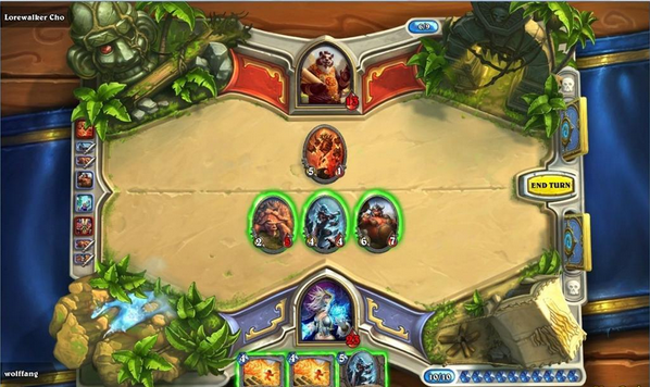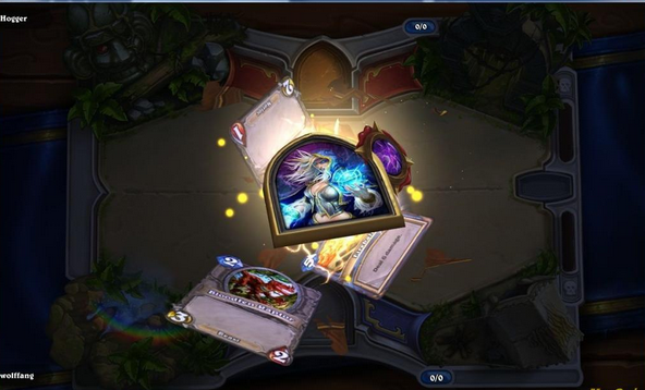 游戏介面非常逗趣且简洁,玩法也相当的简单,首先在场景中央有一条线,此线的下半部为我方场地,上半部则是敌方的场地,中央区块为敌我双方的英雄与出战怪兽,在画面左方则插着敌我双方的排组,每人每副套牌上限为30张牌,这裡将会记录卡牌的剩余张数,而画面左下则会显示魔力水晶,魔力水晶等同于卡牌的「行动力」,是整个游戏的重点核心,最下方则是玩家们的手牌,附带一提,游戏场景也有数个在随机变换,且每个场景各拥有许多彩蛋,保留blizzard的一贯作风,等待玩家去发掘和玩味。