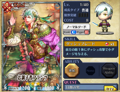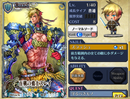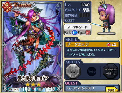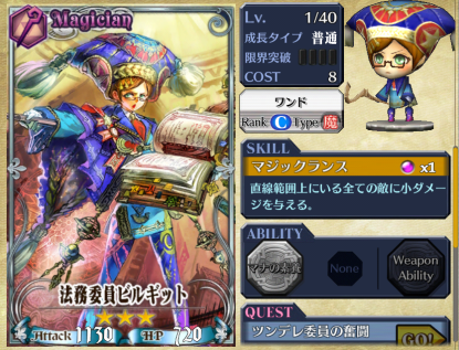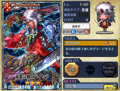 短评:晚成的能力值,没回復主动技的僧侣…..『给义勇军的声援』非常强力,但问题是觉醒任务要到Lv80才接到,即是要完成4次限界突破,如何找来4张卡是超大问题。很不幸地这不是现阶段值得使用的卡,大部份SR僧侣都比她实用。到限界突破完成,学得『给义勇军的声援』后,放在后备队中当啦啦队还比较实际。