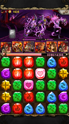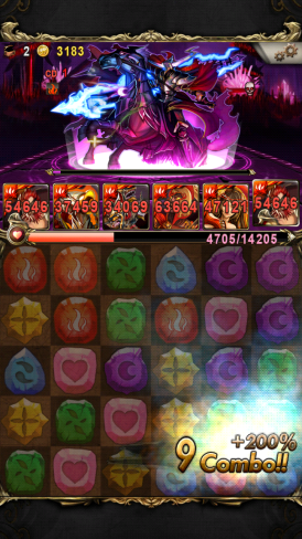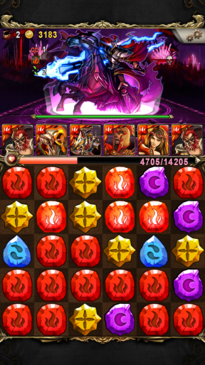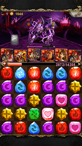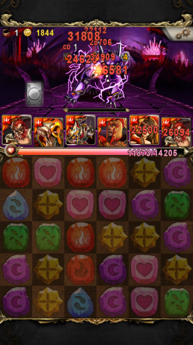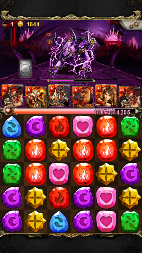 这时候朱雀火狗CD才跳起来...机械豹起始CD3 非常温馨! 上排六火珠尝试两次,成功4 Combo一次,打掉了约40~45%血量,心里就很笃定要是挂上印记只要再成功一次就可以击杀了。四回合后打死左狼+被打一下+回血,断心珠