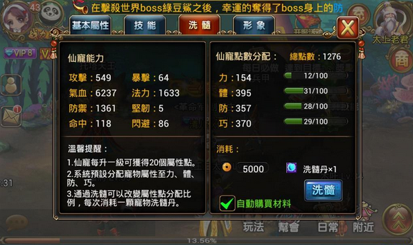 法尊仙宠的洗髓重点在于,洗出30 以上的体防,力属只要不低于20 ,巧属多少都没关系。虽然仙宠攻击力并不是重点,但过低的情况下还是会造成法尊在攻略上的障碍。毕竟就算天天组队,每天的活动还是有不少必须单人进行。