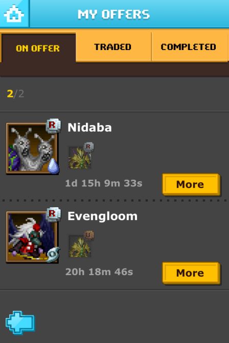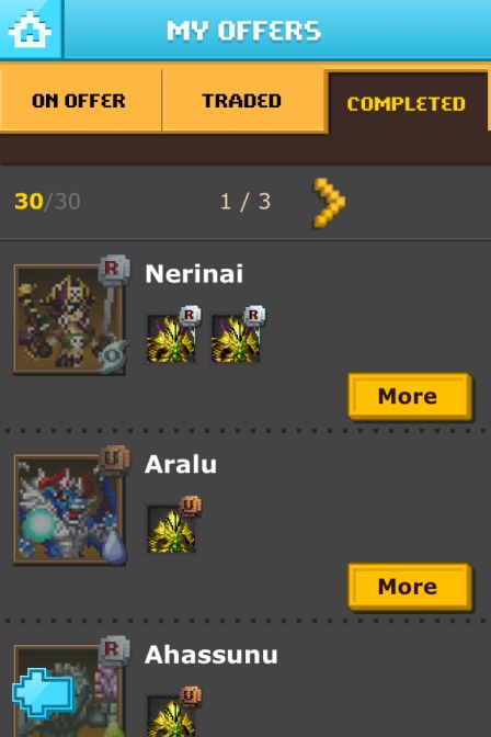 找到你要交易的对象, 点选More就会到下一个画面,这裡会列出交易双方要付出的斗士,上面区块是对方要付出的,下面区块是你要付出的, 在右边有个袋子图示, 那是标示你仓库中目前有几隻斗士。