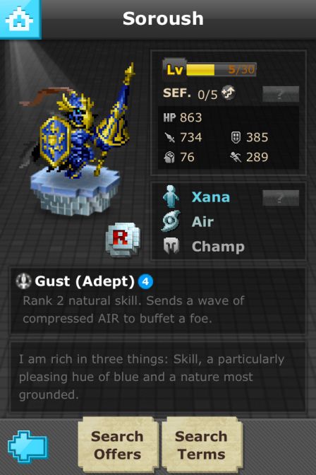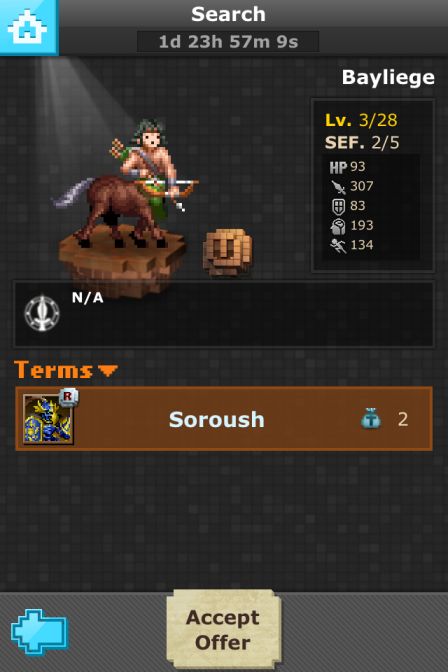 2. Search: 这裡可以用特定的斗士找寻目前市场上的交易, 找到你觉得合理的交易, 接受它就能完成交易, 同样每接受一笔交易上限会减一, 每日接受交易上限为5次。(註: 主动提出交易与接受交易是分开算的, 剩余次数会标示在画面下方)