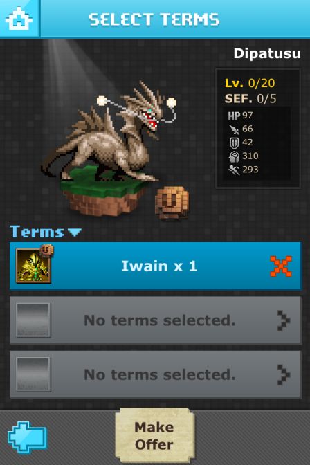 首先来看Offer, 点选进去后就是斗士选择画面, 这裡可以选择你要拿出来交易的斗士,当然要交易前请记得将斗士解锁或移出队伍, 不然会呈现锁定的状态(暗灰色)。