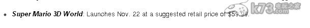 《超级马里奥3D世界》为WiiU独占,游戏的发售日期锁定于11月22日,官方建议零售价格为59.99美元!这个价格比官方第一方游戏大多数的49.99美元还是贵上不少的。