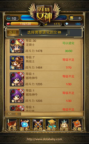 第一次进阶女神,当角色等级达到10级,可以为等级达到30级的白卡女神进行第一次进阶,首先点击主界面上方的“进化”按钮,随后进入女神选择界面,选择需要进化的女神。