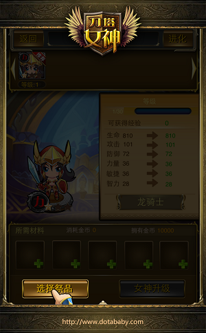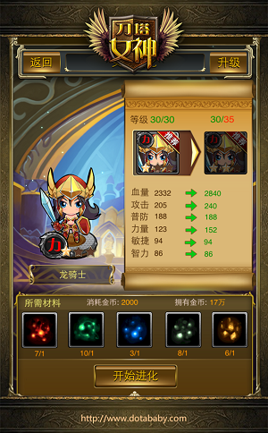 女神进化需要消耗一定的游戏币及材料(材料在副本产出),点击“开始进化”女神属性将大幅提升。通过逐步的进化小萝莉将逐步成长为强力御姐哦!
