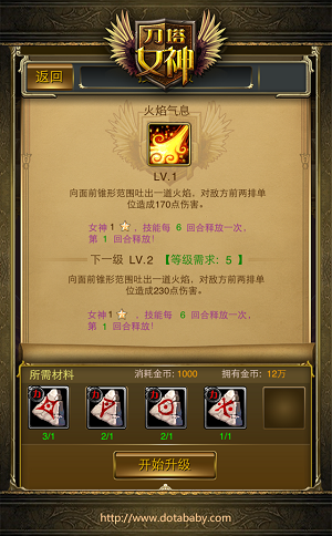 选定好所需要升级的技能后,将进入技能升级界面,会显示当前技能及下一级技能效果。技能升级需要消耗一定的游戏币及材料(材料在副本产出),点击“开始升级”技能效果将提升。小技巧:点击材料图标,会显示材料的产出地点哦。