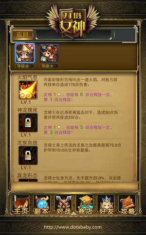 第一次升级技能,点击主界面上方的“技能”按钮,进入技能管理界面(如下图)。在技能管理界面可以切换英雄,选择需要升级的技能。