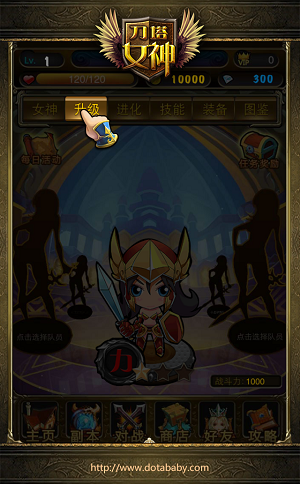 第一次升级女神,首先,请点击主界面左上角的“升级”按钮。