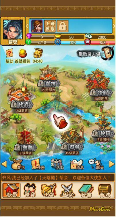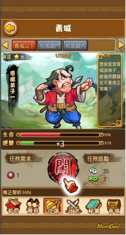 比武招亲此款游戏是以金庸人物为背景并添加逗趣故事为主的一款策略战斗游戏,而在游戏中由于很多功能都需要等级达到一定程度后才会解锁,因此对刚进比武招亲的新玩家来说第一件重要工作就是提高自己的主角等级。而游戏初期最简单快速的练等方法就是勤跑江湖关卡,只要进入游戏首页再点选中央的「江湖」就可以开始你的江湖探险了!