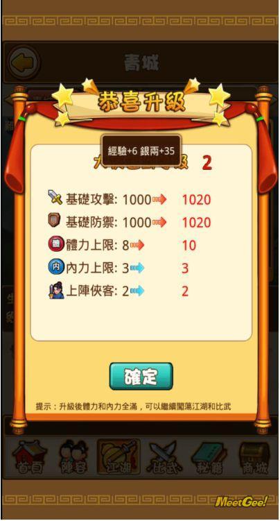 另外提醒新手玩家们,当角色的等级提升之后除了可以增加攻防数值、体力内力上限等属性以外,更重要的是升级后会立即补满体力跟内力,只要善用升级带来的优势就可以连续闯关并加快等级提高的速度,让你一下子就能够跟上老手玩家的脚步了!