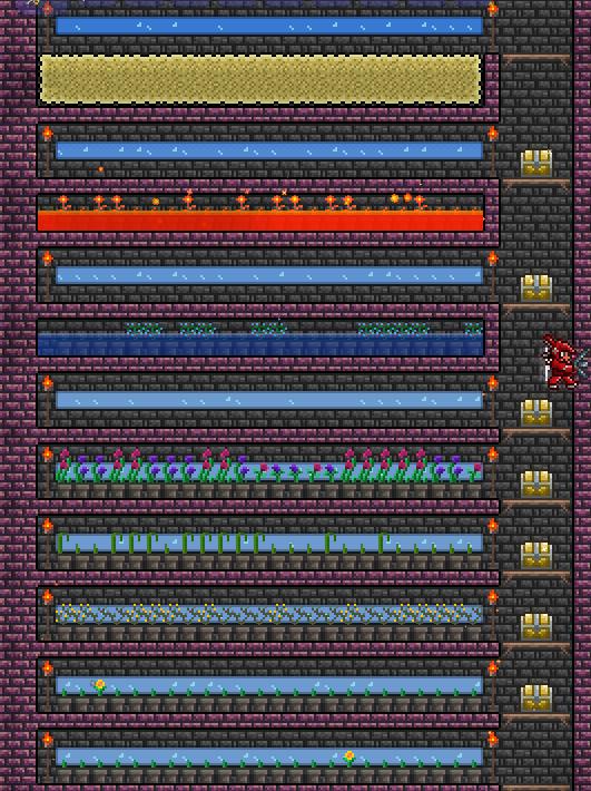 取得种子之后,火焰花与粉蝶花需要用岩浆根水特别照料,岩浆跟水的高度大约一格半,长大后会使他们开花,其他花就如上图所示种植就可了,数量可自己拿捏(图中的算是偏多可以再少一点)。就算没有开花也可以採集就只差没有种子。