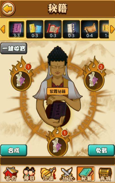 在比武招亲游戏之中除了装备、座骑之外另外一个重要的物品就是秘籍,而秘籍的取得方式与装备座骑等不同,只能够透过收集各种秘籍残卷后再组合起来,才会变成一本完整的武功秘籍。游戏中秘籍残卷的取得方式大致上来分两种,一种是最基本的过关奖励,只要跑江湖或者是闯关就有机会拿到秘籍残卷,不过过关奖励的秘籍残卷大多都是随机产品,也有可能跑一整天的江湖、闯关也都收集不到自己想要的秘籍残卷,这时就要考虑另一种方法「夺经