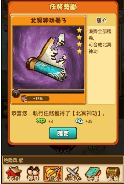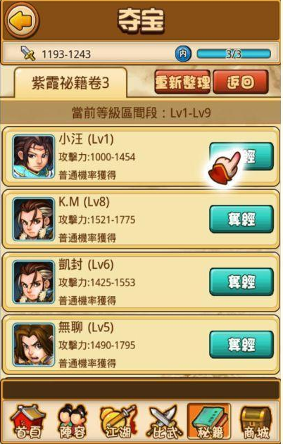 在比武招亲游戏之中除了装备、座骑之外另外一个重要的物品就是秘籍,而秘籍的取得方式与装备座骑等不同,只能够透过收集各种秘籍残卷后再组合起来,才会变成一本完整的武功秘籍。游戏中秘籍残卷的取得方式大致上来分两种,一种是最基本的过关奖励,只要跑江湖或者是闯关就有机会拿到秘籍残卷,不过过关奖励的秘籍残卷大多都是随机产品,也有可能跑一整天的江湖、闯关也都收集不到自己想要的秘籍残卷,这时就要考虑另一种方法「夺经」了。