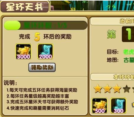 玩家在到达10级后系统会开启星环天书,玩家每天可接取一次星环天书,共分为5环,结束后有额外奖励,每环任务开始时系统会随机给出星星,获得的星星越多奖励越高,最高为5颗,星玩家也可以使用道具刷星星。