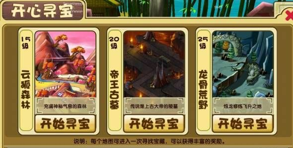 玩家在到达15级后系统才会开通开心寻宝,玩家进入藏宝地图后系统随机刷出藏宝地点,玩家可根据脚下的箭头所指的方向去寻找宝藏。玩家可根据箭头的颜色判断宝藏离自己的远近,当箭头为红色时代表宝藏很远,当箭头变成黄色后代表较近距离,当箭头变为绿色后代表宝藏就在附近,当玩家找到宝藏后系统会显示铁铲子,银铲子,金铲子三种道具,根据铲子的不同所得的物品也不会相同金铲子可以挖到海量的物品,银铲子可以挖到大量的物品,银铲子可以挖到少量的物品,当然只有铁铲子就免费的。每张寻宝地图玩家每天只能寻一次。