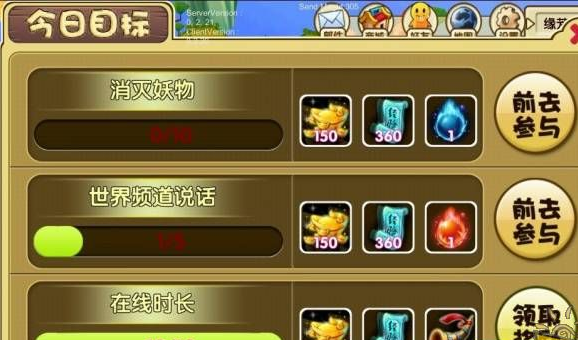 2. 今日目标:可让玩家每天都有明确的目标,知道自己可以做什么事情,系统根据玩家的等级显示每天的不同目标,玩家每天都会有三个不同的目标,当玩家完成相应的目标后可获得相应的奖品。