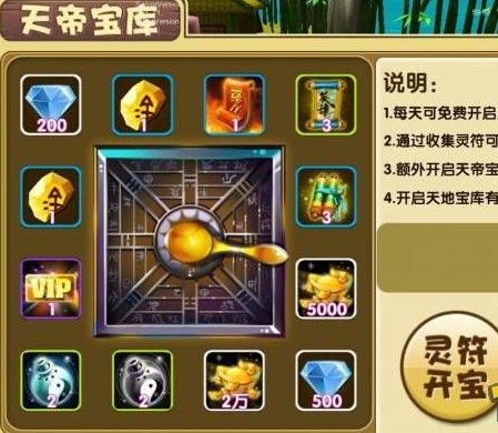 3.天帝宝库:玩家每天获得一个免费开宝的机会,如果免费开宝用完后玩家依然想抽奖,可以用灵符和钻石继续开奖。开宝有几率获得钻石、VIP等各种稀有道具。