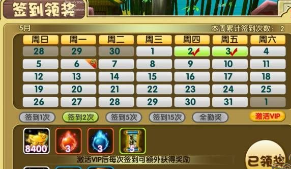 1. 签到奖励:玩家从进入游戏开始就可以签到,签到是通过日历的形式表现,记录玩家签到的次数,玩家每天只能签到一次,系统根据次玩家签到的次数发放对应的奖励道具,激活VIP每天签到可领取额外奖励。当玩家签到1次、2次、5次、15次和全部分别都可领取对应奖励
