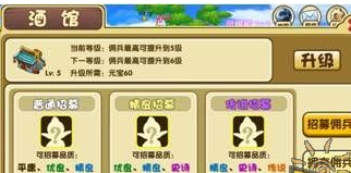 酒馆中主要是用来招募佣兵和升级。招募中,分为三大类:普通招募、精良招募和传说招募,其中,普通招募包括平庸、优良和精良三种品质的佣兵;精良招募包括优良、精良和史诗三种品质的佣兵;传说招募包括精良、史诗和传说三种品质的佣兵。您可以免费招募或者钻石招募刷出传说级的佣兵,传说级的佣兵是品质最好的,但一定要记住及时升级,否则再好品质的佣兵也帮您提高不了多少战斗力的。