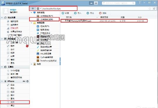 3、附件下载好,解压出来,选择适合你自己的脚本,放到/var/touchelf/scripts,然后我们可以使用PP助手点文件系统后,依次打开就可以看到。
