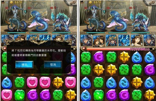 ●主动技:蓄能转换‧水 - 将累积战斗回合数 (需要消除符石) 转换为同等数量的水符石,最多 7 粒,发动技能后会将累积战斗回合数重置