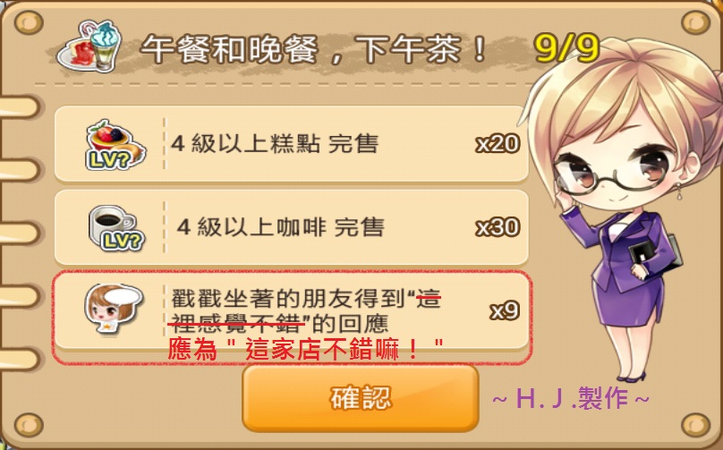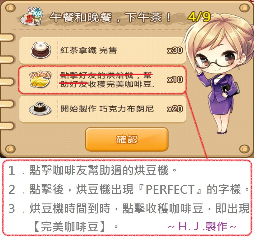 首行得感谢好妹子Hung Ju的分享,妹子喜欢玩这游戏还玩的这么好,谁取到了肯定每天可以喝到最香的咖啡,开个玩笑,这里是LV35级任务完成『现在是Brunch时段』后出现的任务,也就是题中所看到的午餐和晚餐,下午茶的攻略方法了,一起看看吧!再次赞下妹子的排版看着