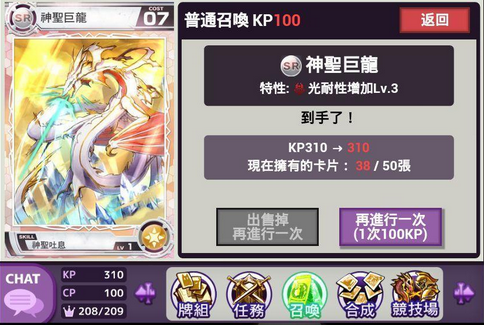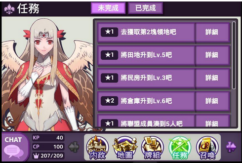 游戏的任务数量相当多,新手城主只要跟着任务指示去盖建筑物、升级设施就可以获得丰富的报酬,利用初期任务送的CP 进行黄金召唤就有机会取得R 以上的实用卡片,KP 则用来抽一般卡片,大多做为肥料合成或是学习技能用,每天有三个时段可以免费召唤一次不花KP ,卡片搭配的使魔越多战斗力就越高,所以除了解任务必升级的建筑之外,也要先把玛那之树的等级提高,玛那上限多才能生产大量使魔,另外民房与农田等级也要提升,赚金币的速度才会快。