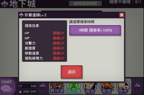 地下城探索是卡片提升各项数值的一个重要方式,且完成探索可获得金钱、玛那与100 点KP 奖励,每次探索完都会出现新的地下城,探索时间分为每一小时、每三小时可进行一次,若推出期间限定的活动则会获得特殊奖励,探索可选择指派1 ~3 张卡片,三张卡片的报酬奖励最高,但是士气未满的卡片不可进行探索;持续努力的探索对新手、老手玩家来说都相当重要,新手可以获得大量金钱、玛那来升级建筑与生产使魔,累积大量KP 才能抽卡片,最好可抽到SR 卡,对于新手来说是很实用的,而老手也能靠探索地下城来提高卡片数值。
