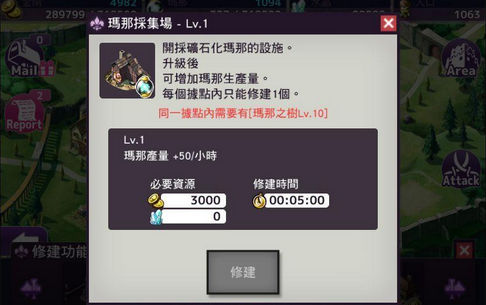 一开始的据点有12 块空地可以建设,跟着任务引导会先盖起田地、仓库、玛那之树、军营、民房等基础建筑,这些建筑兴建与升级时间都很短,每个据点最多只能盖三个田地、三个玛那之树、三间民房,是玩家最初的金币、玛那来源,建筑等级越高、数量越多,每小时的产值就越多,玩家可以点击资源设施的「详细」来查看城市每小时的资源产量。