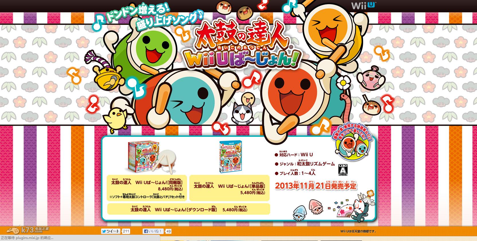 NBGI官方于今天公开了将于11月21日登陆WiiU平台的独占音乐节奏游戏《太鼓达人WiiUば~じょん!》的游戏官方网站,同时官网还公开了游戏的价格、同捆版以及新确认登场歌曲名单。