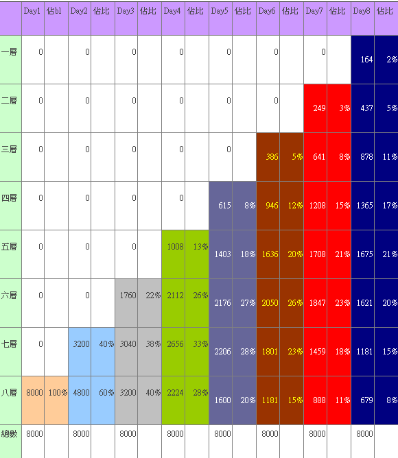 表A:只有8000名玩家时的状况表(但实际状况会因为后进玩家及撤煺玩家的增加而产生变化)