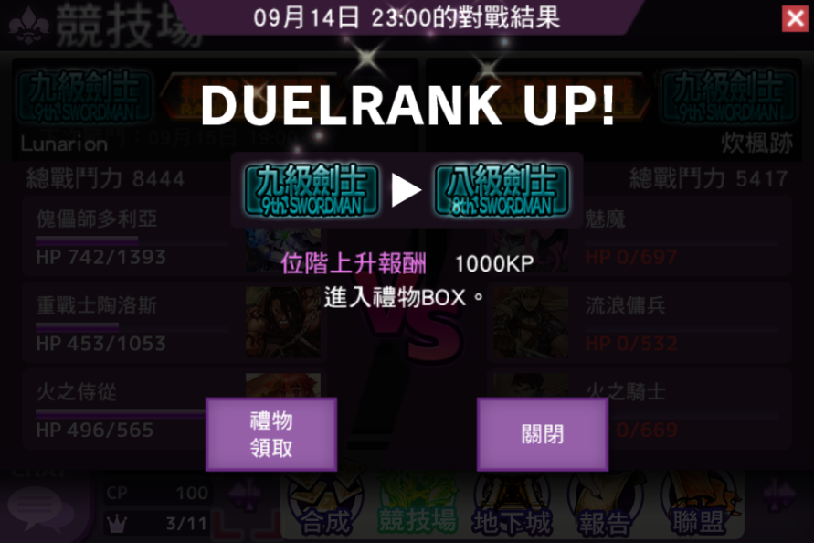 而除了解任务之外也还有一些其他的赚KP方法,再来就是打打竞技场,一胜有100KP、一败有30KP,一天打4场最惨的情形有120KP,运气好全胜就400KP。至于如果有打赢位阶挑战赛成功进阶的话,可以拿到1000~2000KP,依你的阶级而定。