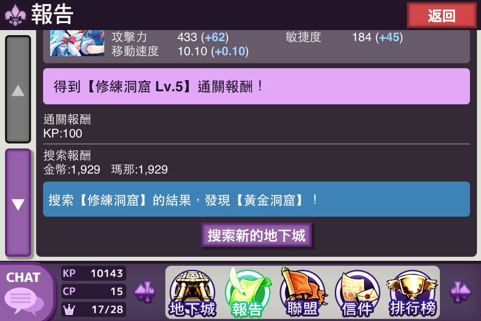 另外KP获得的方式是跑地下城,不过只限"过关"的情形下才有KP报酬,通常一个地下城的KP报酬只有100。还有就是在战斗中被消灭的使魔会还塬成为KP,比例大约是5~6使魔换1KP,其实也是很少。整体来说,赚KP最好的方法还是任务跟竞技场(如果其他人有好的赚法也帮忙整理一下吧)