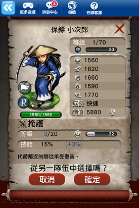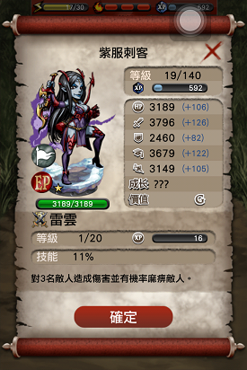 例如此这张紫服刺客为例,每次升级素质的成长幅度约是一百左右,若是游戏中时常看见的野猪,在升级后各素质可能只会成长50,不过藉由冒险提升等级来提升战斗力应该是所有玩家最常做的事。