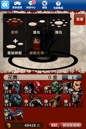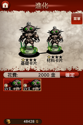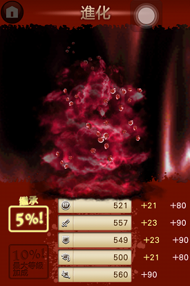 进化也是玩家们不可错过提升战斗力的方式,藉由两个完全相同的角色彼此合成,来提升角色的能力,可以由右图看见除了进化之后的可以提升角色的战斗力外,进化还有一个很特别的地方就是它可以继承被合成掉的那张卡片一部分的能力,这个範例中继承了5%,若是被合掉的卡片满及的话,可以得到10%最高的继承。