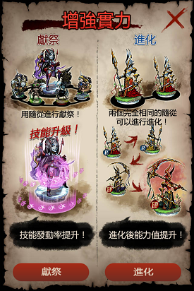 在游戏裡可不是只能藉由冒险升等来提升战斗力,玩家们还可以选择图中那几种方式,不同的方式对角色所提升的能力也会有所不同,玩家们也可以根据随从本身的能力或是手中所拥有的卡片来决定用不同的方式提升战力。