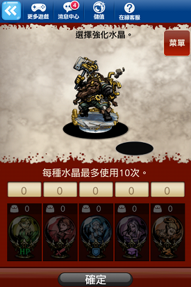 在强化这个系统中需要用到水晶来进行,水晶会提高随从的能力值,在游戏中总共有五种水晶分别是生命、攻击、防御、智慧、敏捷,水晶的获得方式除了玩家课金以外,还能够透过解任务的方式来得到,例如PVP排名、爬塔活动等。在强化系统中每个随从每个不同的水晶都只能使用十次,每项能力值最高能够增加500。
