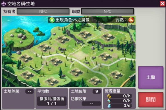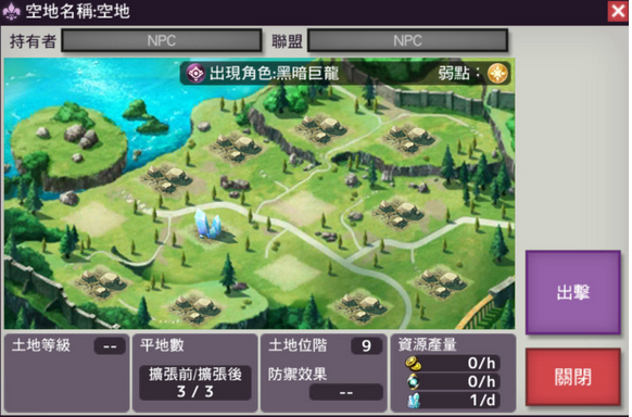 而除了玛那、金钱的地块之外还有水晶地块,水晶地块会有5阶、7阶、9阶这叁个选择,不过每个选择的产量都是1天1水晶,差别只有7阶、9阶可建设用地多1块,不过我想也没人会在水晶地上盖据点,所以真要佔的话佔5阶就好了,浪费兵力去打7、9阶不划算。